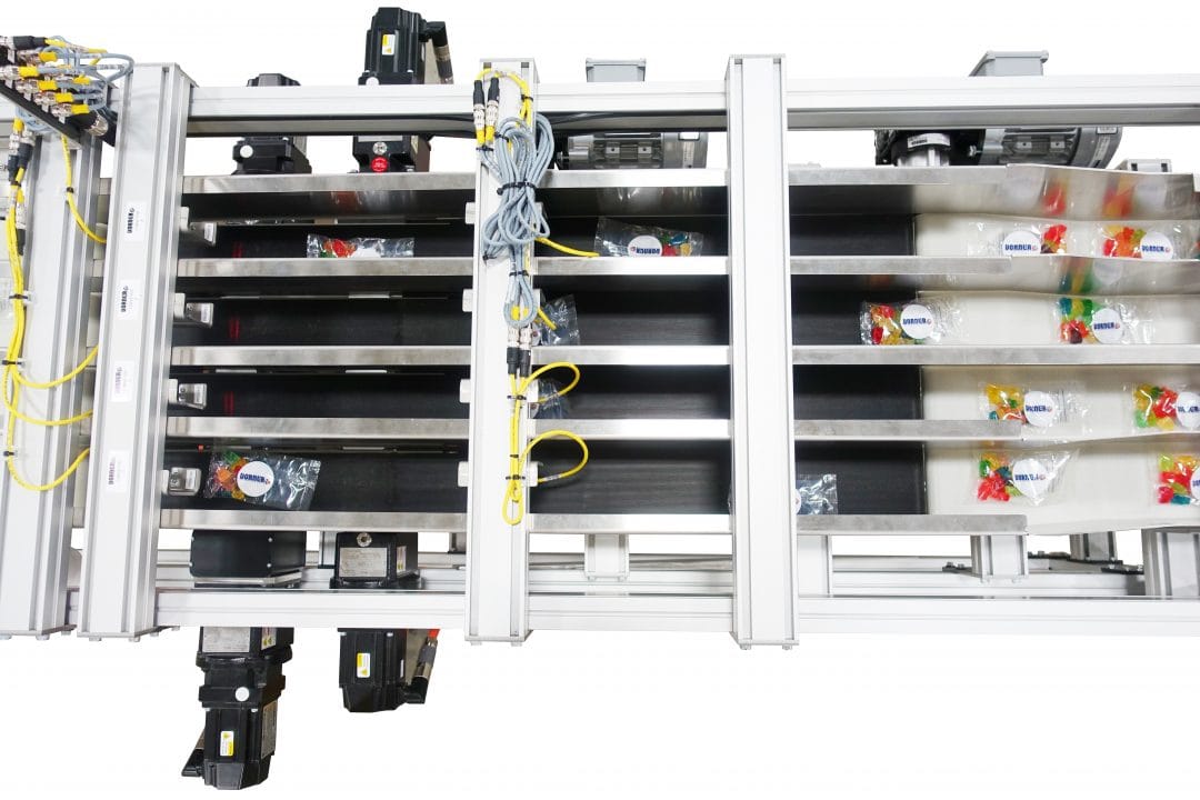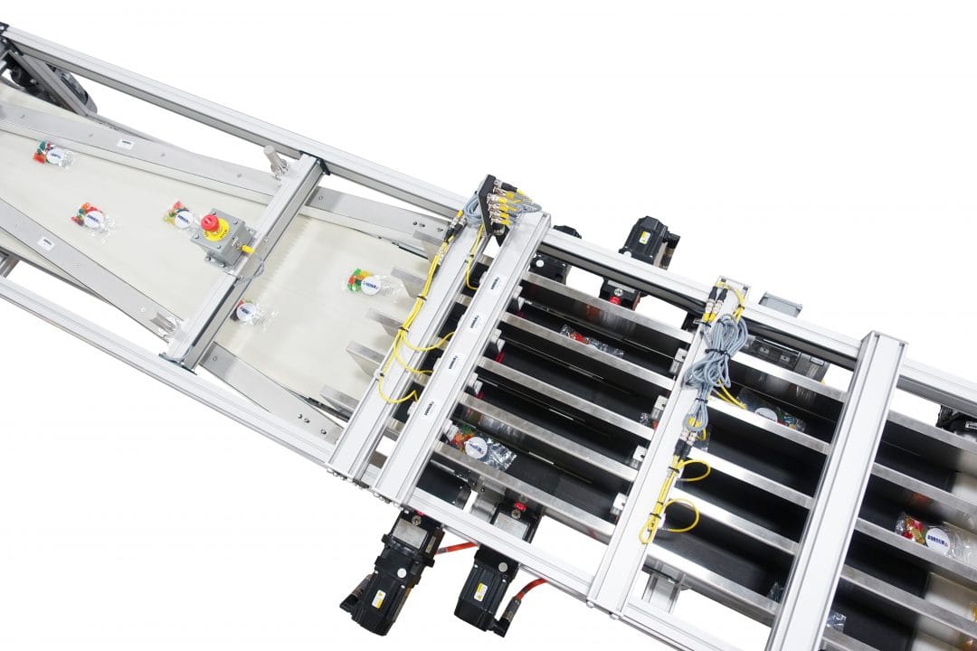 Dorner merged the product using a combination of high speed sensors, servo motors and 2200 Series pacing conveyors. Two common infeed conveyors (center and right conveyors above) initially gap the product prior to each of the 4 individual servo conveyors (lanes).